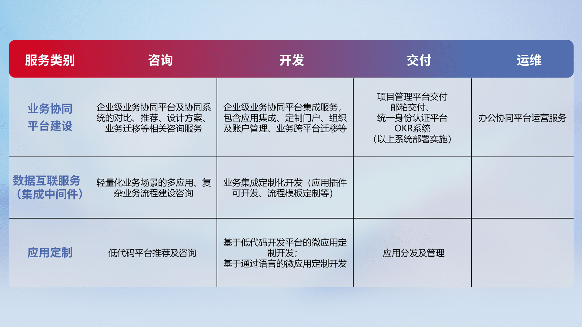 针对钉钉、、、企微、、IDaas等平台级产品提供产品的规划、、、、方案、、交付、、定制化开发等服务,,,,实现如统一协同办公、、、、智能客户服务、、、、混合会议管理、、、智能数据查询、、等业务场景,,实现数字化转型。。。